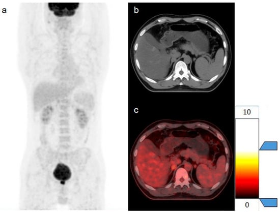 Patient No. 15 (a) The maximum density projection (MIP), (b) the high-resolution CT, and (c) the PET/CT.