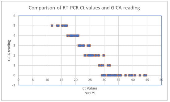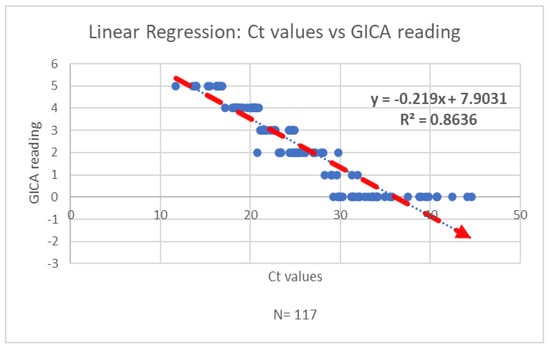 The correlation coefficient (Pearson’s r) between the Ct value and GICA reading is approximately −0.95. This indicates a strong negative correlation between the two variables, suggesting that higher Ct values are associated with lower GICA results (Figure 3).
