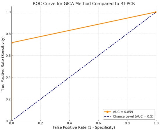 The performance of the GICA method was evaluated against the gold standard RT-PCR using the receiver operating characteristic (ROC) curve and the area under the curve (AUC). The GICA results were converted into a binary classification, where non-zero values were considered positive. The ROC curve was plotted by comparing the true positive rate (sensitivity) and the false positive rate (1 – specificity) across various threshold settings.