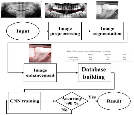 , each containing two teeth. The standardized double-teeth images were then enhanced to improve the visibility of the symptoms. The enhanced images were used to train the CNN model, which was capable of recognizing impacted teeth.