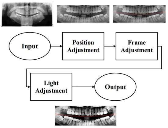 Due to the excessive amount of information present in unprocessed PANO images, irrelevant features may negatively impact the training and recognition performance of the CNN model. To construct an optimal dataset for this study, three preprocessing steps were applied: position adjustment, frame adjustment, and light adjustment, as shown in