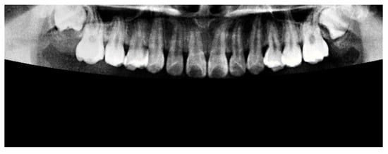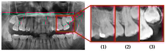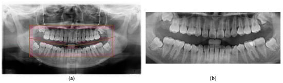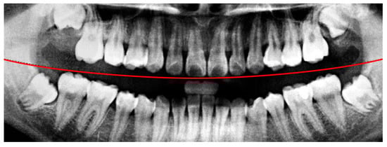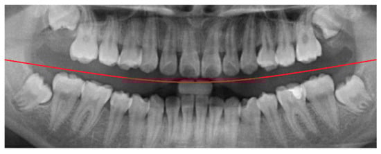 Figure 3. Using this reference region, only the relevant portions of each original PANO image were retained. This cropping process effectively eliminated extraneous areas outside the alveolar bone, thereby enhancing the accuracy and efficiency of the subsequent recognition tasks performed by the CNN model.