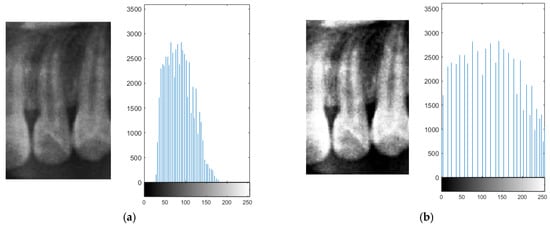 In the segmentation step, both the teeth and non-object regions such as the background and interproximal spaces between the teeth exhibited low local contrast, which could lead to inaccuracies when isolating teeth. By applying histogram equalization, bone structures and dental boundaries became more pronounced, contributing to improved segmentation accuracy. The visual improvement resulting from histogram equalization is shown in