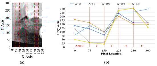 For vertical adjustment, the system first verified whether the crown of the target tooth was included within the segmentation frame. To achieve this, five columns of pixel intensity values, each 300 pixels in height, were extracted from the image at fixed x-coordinates: x = 25, 50, 100, 150, and 175. The resulting intensity distributions were used to guide the alignment and are shown in