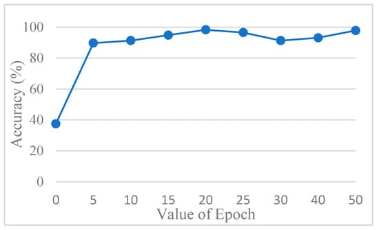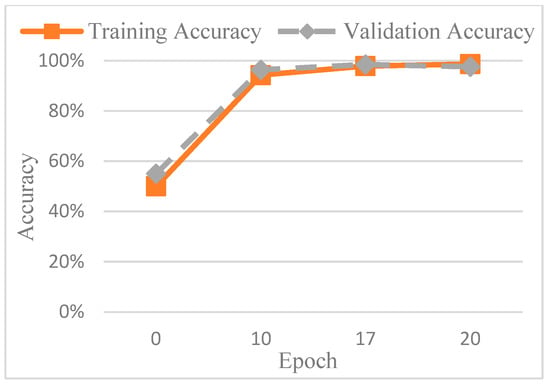 Figure 13 shows the accuracy trend across the epochs, and based on these observations, the number of epochs was set to 20 to balance training performance and overfitting risk. The final training accuracy curve of AlexNet is shown in