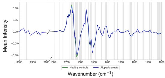 Mean pre-processed intensities of the wavenumbers in healthy controls (green line), which are significantly different from those in alopecia areata patients (blue line, highlighted with a grey shade).