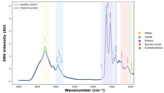 The average SNV-normalized absorbance spectra for alopecia areata patients (blue line) and control patients (green line) are shown, with emphasis on the median spectra from the full dataset. Key functional groups and their associated biomolecules are represented by specific wavenumbers in the mid-IR region. The lipid region is characterized by several distinct peaks, including C=O stretching of ester linkages at approximately 1740 cm−1, C-H stretching around 3000 cm−1 (saturated fats) and 3009 cm−1 (unsaturated fats), as well as C-H bending at approximately 1465 cm−1, which corresponds to methylene scissoring modes in fatty acid chains. The protein region is defined by Amide I bands, which correspond to C=O stretching, and Amide II bands, which represent N-H bending and C-N stretching. These bands are key markers of protein structure and provide insights into conformational changes in serum proteins. The nucleic acid region includes signals from the phosphate backbone of DNA and RNA, with PO2− asymmetric stretching occurring at approximately 1220 cm−1 and PO2− symmetric stretching at approximately 1080 cm−1. These peaks indicate nucleic acid integrity and may reflect disease-related changes in cellular turnover. Additionally, carbohydrates were identified by C-O stretching in the 1150–1000 cm−1 region, which highlights the presence of glycoconjugates and polysaccharides in the serum. Finally, the water bands absorbed in the 3550–3200 cm−1 region due to O-H stretching reflect the hydration states, which can influence the overall spectral profile.