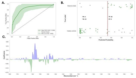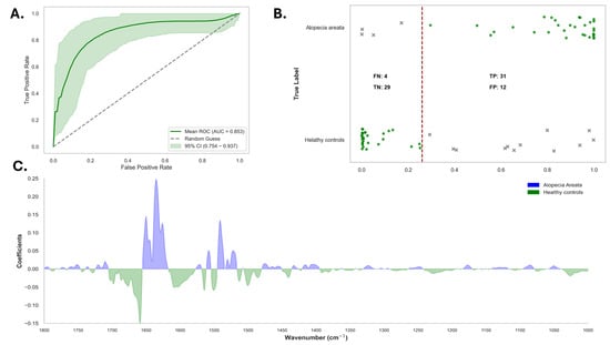 Performance of the logistic regression model in discriminating between patients with alopecia areata and healthy controls. (A) Receiver operating characteristic (ROC) curve of the logistic regression model. The curve plots the true positive rate (sensitivity) against the false positive rate (1-specificity) across all possible thresholds. The shaded region represents the 95% confidence interval (CI) of the mean ROC curve, reflecting the variability of the model performance across resampling iterations. The model achieved an area under the curve (AUC) of 0.853, with a 95% confidence interval (CI) ranging from 0.754 to 0.937. (B) Probability plot showing the predicted probabilities from the logistic regression model against true class labels. Each dot represents an individual participant, stratified by their true label: “alopecia areata” (top panel) or “healthy controls” (bottom panel). A classification threshold of 0.26 (indicated by the vertical dashed line) was applied to distinguish between the two classes. Dots to the right of the threshold are predicted as “Alopecia areata”, while those to the left are predicted as “healthy controls”. True positives (TP), true negatives (TN), false positives (FP), and false negatives (FN) are color-coded; black dots indicate correct classifications (TP and TN), whereas red crosses denote misclassifications (FP and FN). The model yielded 31 true positives and 29 true negatives, with 12 false positives and 4 false negatives. (C) Feature importance plot depicting the logistic regression coefficients across the vibrational spectral range (1700–100 cm−1). Each coefficient reflects the weight assigned to a specific wavenumber region during the model decision-making process. Positive coefficients (blue) indicate spectral regions that contribute more strongly to the prediction of “alopecia areata”, whereas negative coefficients (green) indicate spectral features associated with “healthy controls”. The spectral region around ~1650 cm−1 shows the highest positive contribution, likely corresponding to protein- or Amide-related bands, which may reflect disease-related biochemical alterations.