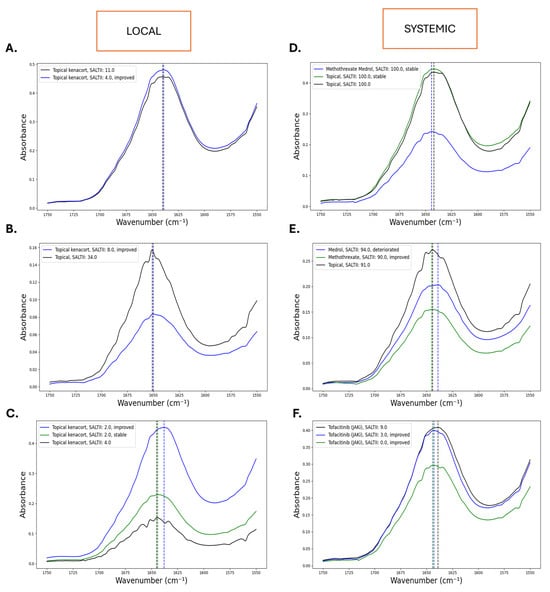 Panel D presents a patient receiving Methothrexate and Medrol who remained stable during follow-up; however, IR spectra faced interference from systemic treatment. In Panel E, the patient also received Medrol and deteriorated after 6 months; however, the Amide I peak shifted to the right side of the IR spectrum. Contradictorily, after 12 months, the patient was treated with Methothrexate, and the Amide I peak shifted to the left side as the patient improved. Finally, Panel F displays a patient being treated with JAK inhibitors, and it showed a shift to the left side of the Amide I peak as it improved clinically, which is also contrary to the effects seen in locally treated patients.