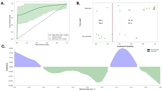 Model performance and importance of spectral features for the classification of alopecia areata. (A) Receiver operating characteristic (ROC) curve illustrating the classification performance of the model, with a mean area under the curve (AUC) of 0.863 and a shaded area representing the 95% confidence interval. The broken line represents the random classifier performance. (B) Predicted probability plot with classification outputs, actual labels for alopecia areata, and healthy controls divided by a decision boundary (red dashed line), with counts for true positives (TP), false positives (FP), true negatives (TN), and false negatives (FN). (C) Visualization of the importance of spectral features as model coefficients against wavenumbers (cm−1). Contributions to classification are shown as positive and negative for responders (green) and non-responders (blue), respectively, and where important spectral regions between groups are distinguished.