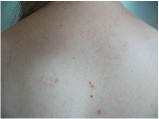 Numerous telangiectatic vessels on the upper back. Below left is the biopsy scar.