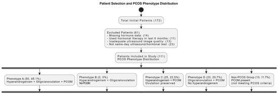 The study encompassed 111 subjects aged 18–42, with a median age of 23 (21–26). Patient selection criteria and PCOS phenotype distribution are presented in Figure 1.