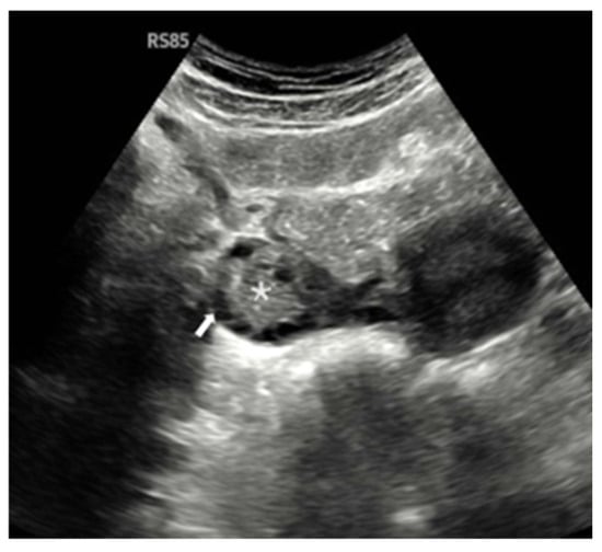 Gray-scale transabdominal ultrasound image in a 22-year-old female demonstrating polycystic ovarian morphology (PCOM). The central ovarian stroma is marked by an asterisk (*), and multiple peripheral follicles (each measuring 2–9 mm in diameter) are indicated by the white arrow. The ovarian volume was calculated as 12 mL. The presence of a prominent central stroma, numerous peripherally arranged follicles, and increased ovarian volume are consistent with PCOM.