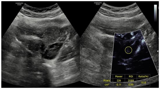 Patients were enrolled consecutively sampling approach, and ultrasonographic evaluations were performed during routine clinical practice. Initially, assessments were carried out by one of two experienced radiologists (with 10 and 7 years of expertise, respectively), based solely on patient assignment at presentation, as part of standard clinical care. Consequently, radiologists accessed clinical and laboratory data during these initial evaluations. All patients underwent examinations in the supine position with a full bladder. Images were captured using gray-scale and MV-Flow Doppler imaging and securely stored locally after anonymization by removing all identifying DICOM tags. Subsequently, anonymized images meeting quality criteria—specifically, those acquired in the longitudinal plane with cine-loop recordings of at least 3 s duration—were independently re-evaluated by both radiologists, who remained blinded to clinical information and laboratory results, to determine interobserver agreement for vascularity index measurements. Images failing to meet these quality criteria were excluded from the analysis.