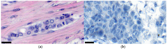 An example detailing breast cancer cells obtained under different conditions (a,b). Staining with hematoxylin–eosin. The magnification of the samples is indicated by markers in the lower left corners of the images (20 μm).