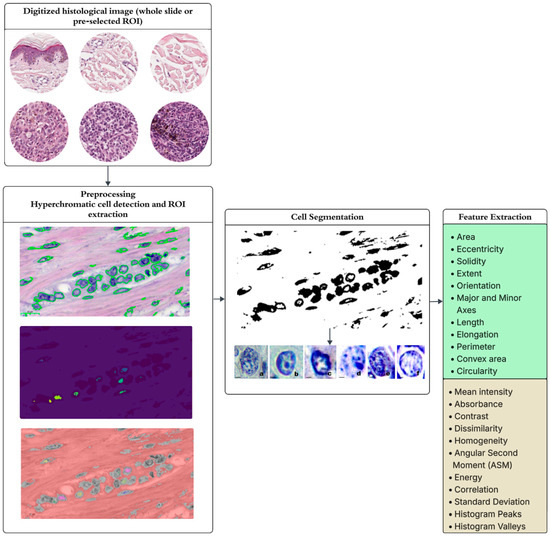 Traditionally, pathomorphological diagnosis of breast cancer has relied heavily on visual assessment of cellular and nuclear morphological features, such as size, shape, the nuclear–cytoplasmic ratio, and the chromatin status [16,17]. While these methods are fundamental, their subjectivity and dependence on the pathologist’s experience can lead to inter- and intra-observer variability. Furthermore, quantitative evaluation of these features, especially when analyzing large volumes of whole-slide imaging (WSI) data, is a laborious and inefficient process [18].