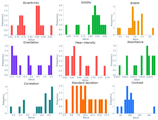 In this instance, the lesion occupies 17% of the biopsy, which is insufficient for diagnosis. Further classification of the region of interest based on nuclear features is necessary. Consequently, the system selected approximately 40 cells in Figure 4 and transformed them into mathematical objects for subsequent analysis by the intelligent component. Some of their nuclear features are illustrated in Figure 5: Eccentricity measures the ratio of the distance between the foci of a cell to the length of its major axis. The closer this indicator is to one, the more elliptical the cell shape, which approaches a straight line. Solidity is the ratio of the area of a cell to its perimeter. A low value may indicate an abnormal morphology or damage to the cell membrane. The extent is the ratio of the area of a cell to the area of its minimum describing rectangle. It indicates how compact an object is, and a low value indicates an abnormal cell shape. The orientation is the angle at which an object is directed. It can help understand the alignment and, possibly, the dynamics of cellular structures. The mean intensity is the average pixel intensity in a cell region, which can help determine the structural and chemical properties of a tissue. Absorbance measures the amount of light absorbed by a sample. In microscopy or medical imaging, absorbance can sometimes be measured by how much light is blocked or absorbed by an image region, which is often related to the density or thickness of the sample. Correlation determines how linearly dependent pixels are on each other in a texture matrix. High correlation may indicate structural integration and orderliness in a tissue. The Standard Deviation assesses the diversity of pixel intensity values in an area of interest. A high Standard Deviation may indicate tissue heterogeneity, which is typical of many pathologies. Contrast is a measure of differences in intensity between adjacent pixels. High contrast in a histological image may indicate significant structural changes in the tissue, such as fibrosis or proliferation.