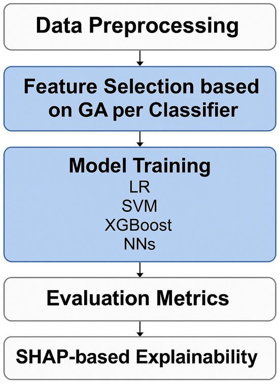 To handle missing data in the dataset, the mode imputation strategy was used, which involves replacing missing values with the most frequently occurring value in the dataset. The study employed the genetic algorithm (GA) as a feature selection method to identify the optimal subset of features for improving the performance of the classifier. Four classifiers, namely, logistic regression (LR), support vector machines (SVMs), XGBoost, and neural networks (NNs), were used in the learning process, and a 70%/30% training/testing validation strategy was employed. These classifiers were selected based on their diverse strengths: LR serves as a simple and interpretable baseline; SVMs are effective in high-dimensional spaces and can model complex decision boundaries; XGBoost is powerful for capturing non-linear feature interactions and managing structured data; and NNs excel at recognizing intricate patterns in the data. Internal 10-fold cross-validation was used during the training phase to tune the hyperparameters after the undersampling step in the internal phase. The validation metrics included accuracy, recall, precision, F1 score, and specificity. The SHapley Additive exPlanations (SHAP) model assigns feature importance values using the concept of Shapley values from cooperative game theory and is a powerful tool for understanding the decision-making process of an ML model. All code for the development, training, and evaluation of the ML models was written in Python 3.9 utilizing the Scikit-learn library (https://scikit-learn.org/, accessed on 30 March 2025) as the primary framework for implementing ML algorithms and techniques. An ML pipeline was constructed to visually represent the methodology employed. The pipeline includes data preprocessing, FS using GA, training of four classifiers, evaluation through multiple metrics, and interpretation using SHAP values (Figure 2).