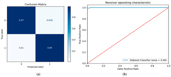 Additionally, Figure 3 depicts the normalized confusion matrix and the receiver operating characteristics (0.98) for our best ML classifier. Specifically, the XGBoost classifier achieved 0.99 sensitivity and 0.97 specificity in this binary task.