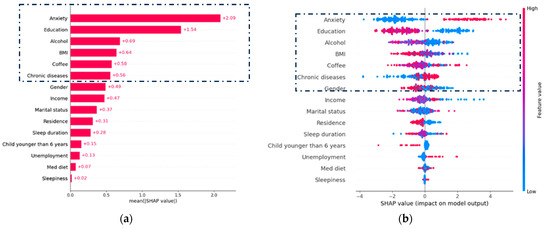 In Figure 4, the effects of the 15 most significant risk factors on the output of the top-performing ML model (XGBoost) are illustrated. Figure 4a shows the mean absolute value of the SHAP values, which is an indicator of the SHAP global feature importance. Notably, the risk factors of anxiety, education, alcohol, BMI, and coffee had the greatest impact on the prediction output and were considered the most important features. Figure 4b displays the effect of each feature on the output of the final model (XGBoost) applied to the depression dataset. The features are sorted based on the sum of their SHAP value magnitudes across all samples. SHAP values are based on game theory and assign an importance value to each feature in a model. Features with positive SHAP values positively impact the prediction, while those with negative values have a negative impact. The magnitude is a measure of how strong the effect is.