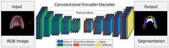 A deep network architecture was devised to perform semantic segmentation of 2D images using an Encoder–Decoder–Skip based on SegNet [6,7], which relies on a VGG-style encoder–decoder. Because the regions of teeth and rugae appear as continuous blobs in the 2D images, an attention layer was designed and introduced into the network to improve training accuracy.