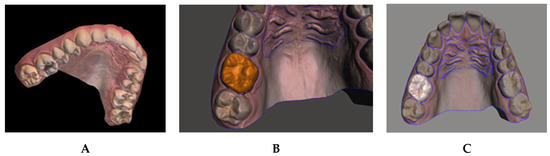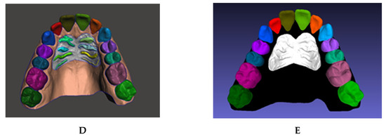 The 3D meshes used for semantic segmentation were annotated by assigning a class to every vertex in the mesh and were manually segmented using Meshmixer [11]. In this process, the user can select the vertices that represent an individual element and separate the selected shell into an independent component. Manual selection often results in rough edges because of limitations of human precision. Therefore, a built-in boundary smoothing tool was applied before finalizing the selected regions for separation, ensuring a more accurate and visually coherent segmentation. The procedure was performed on a total of 100 3D scans, generating independent components of the teeth and rugae patch (Figure 2B–D).