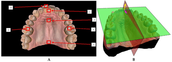 The coordinate frame was defined by manually placing 6 spheres on specific anatomical landmarks of the mesh (Figure 3A). The spheres were positioned at the molar cusps, at the incisor edges, and along the median raphae in the rugae region. Two planes could be generated: the occlusal plane, determined by the centers of the three spheres located at the cusps of the molars and incisors, and the sagittal plane, defined by the alignment of the spheres located along the median raphae, through the middle of the rugae patch [14]. A coordinate frame was defined with the z-axis normal to the occlusal plane, and the x-axis along the line of intersection of the occlusal and sagittal planes. The origin of the coordinate frame was defined as the normal projection of the center of the sphere located at the incisive papilla onto the occlusal plane. The y-axis was drawn to complete a right-handed orthonormal frame, ensuring consistency across all scans (Figure 3B).