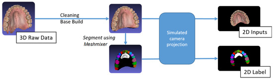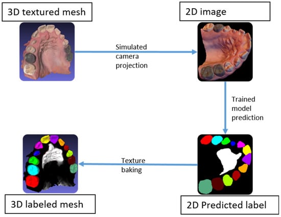 A simulated camera projection was used to transform the 3D textured meshes into 2D images, taken from various viewpoints. The 100 viewpoints were distributed randomly on a hemisphere with the camera’s optical axis pointing toward the 3D scan. The vertical axis of the camera was randomly rotated about its optical axis to randomize the rotation of the mesh within the 2D projections. The projections were applied to the textured 3D mesh and the associated 3D labeled mesh. Accordingly, for each 3D mesh, this method produced 100 pairs of 2D images, along with their associated labels. The flowchart depicting the process is shown in Figure 4. This labeling method not only eliminated the time needed to hand label the 2D images, but also produced accurate and consistent labels for all classes.