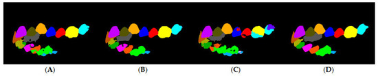 Lighting was not used for the associated 3D labeled mesh; instead, the colors were assigned as glowing colors. Moreover, the anti-aliasing option of the shader was turned off, ascertaining the lack of color mixing at the boundary between two labels. Another augmentation was implemented that randomized the perspective projection of the camera model, thereby simulating the mesh projection at various perspective distortions. For each 3D mesh in the original 3D dataset, 100 2D images were created with their associated labels. Thus, the 2D dataset of images included 10,000 labeled images. A sample of the images, various data augmentations, and the associated image labels are shown in Appendix A (Figure A1).