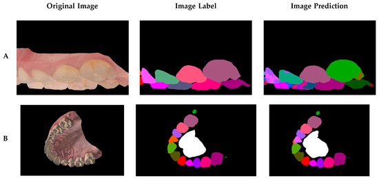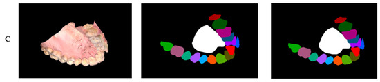 In a sample of the prediction results (Figure 7), the worst, average, and best prediction outcomes are shown in the rows A, B, and C, respectively. The training results are shown in Table 2, in which a precision metric is defined as the ratio of all of the correctly detected pixels with respect to the predicted pixels. Certain labels have low accuracy compared to others because they were not as common in the dataset, such as the labels of primary teeth and third molars. The final training had an average accuracy of 98.69%, an average precision of 98.71%, and an average mIoU score of 85.41%. To assess the network accuracy on the labels found in most scans, the adult teeth average mean IoU was introduced, similar in calculation to the average mean IoU score, but excluding third molars, primary teeth, rugae, and background. The average mean IoU score was 84.26%.