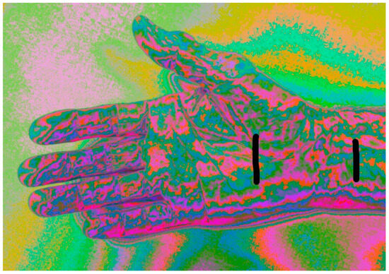 The NEV camera captured images 5 cm above the palm in a controlled environment (19 °C, 20% humidity, 824 Lux, 6350 Kelvin; see Figure 1). Palms were placed on a matte surface to standardize pressure [17]. The central 50% of images was the ROI (see Figure 2).