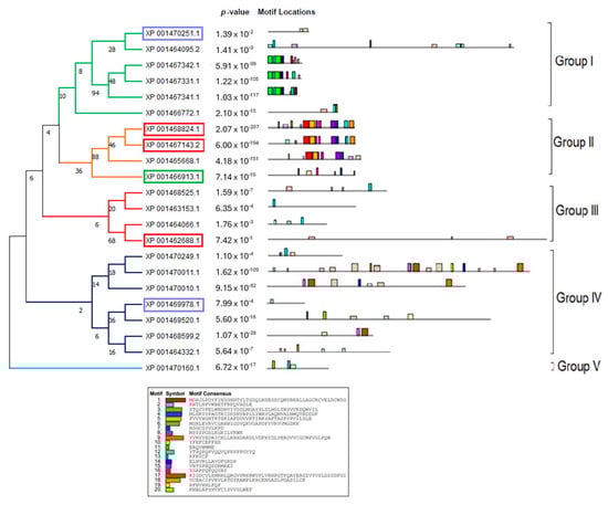 In order to accurately depict the evolutionary relationships of the LiPI-PLC and LmPI-PLC proteins, we conducted phylogenetic analyses. Since there were not enough sequences in other species, we performed analyses within species and between L. infantum and L. major. Based on protein sequences, the LiPI-PLC gene family was classified into five groups, with Group IV consisting of the highest number of proteins, while Group V had only one representative (Figure 1). In L. major, a total of 22 LmPI-PLCs were classified into six groups, with Group III containing the highest number of proteins (Figure 2).