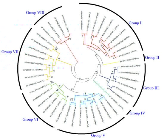 The phylogenetic tree of PI-PLC genes based on protein sequences from L. infantum and L. major is shown in Figure 3. In the phylogenetic tree, PI-PLC family proteins were grouped into eight subfamilies. LiPI-PLC XP001470160.1 and LmPI-PLC XP001686657.1 were clustered separately. Group I had the highest number of PI-PLC family members.