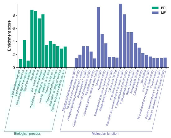 In the Gene Ontology (GO) and KEGG analysis of the PI-PLC genes, only biological process (BP) and molecular function (MF) information were accessible. We identified 13 items under BP and 25 items under MF. The most enriched BP items included signal transduction, signaling, and regulation of membrane potential. Under MF, potassium channel activity, hydrolase activity acting on ester bonds, and potassium ion transmembrane transporter activity were significantly enriched (Figure 5).