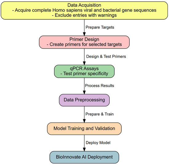 Background/Objectives: Emerging infectious diseases pose significant global threats due to their rapid transmission, limited therapeutic options, and profound socioeconomic impact. Conventional diagnostic techniques that rely on sequencing and polymerase chain reactions (PCR) frequently lack the speed necessary to efficiently respond to rapidly evolving pathogens. This study describes the development of BioInnovate AI to overcome these limitations using machine learning to expedite PCR assay development. Methods: The ability of BioInnovate AI to predict optimal PCR reagents across multiple pathogens was assessed. Additionally, random forest classifier, light gradient boosting machine (LGBM), and gradient boosting classifier models were evaluated for their ability to predict effective PCR primer–probe combinations. Performance metrics, including the area under the curve (AUC), sensitivity, specificity, accuracy, and F1 score, were assessed to identify the optimal model for platform integration. Results: All machine learning models performed well, with the LGBM model achieving the highest metrics (AUC: 0.97, sensitivity: 0.93, specificity: 0.91). BioInnovate AI significantly reduced PCR assay development time by approximately 90%, enabling rapid design and reagent optimization for multiple pathogens. Conclusions: BioInnovate AI provides a rapid, accurate, and efficient method for PCR reagent design, significantly enhancing global diagnostic preparedness by optimizing primers and probes for the timely detection of infectious diseases.