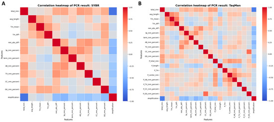 Correlation heatmaps of molecular features influencing PCR amplification success. Heatmaps depicting the relationships between key features and amplification outcomes for the SYBR Green (A) and TaqMan (B) assays. An increase in total mismatches negatively correlates with amplification success in both methodologies.