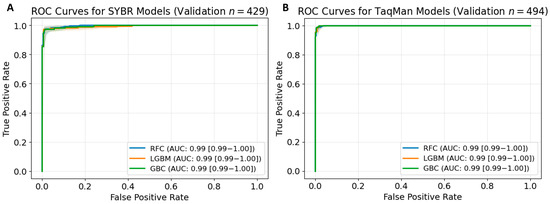 All predictive models demonstrated strong predictive capabilities (Table 1), achieving AUC values of 0.99 across both the training and validation datasets for SYBR Green (Figure 3A) and TaqMan (Figure 3B). In the SYBR Green dataset, the RFC demonstrated the highest performance, with sensitivity, specificity, and accuracy scores reaching or exceeding 0.97 and with an AUC of 0.99. The LGBM and GBC achieved strong metrics, with sensitivities and accuracy at 0.95 and 0.97, respectively. However, GBC achieved a slightly higher specificity (0.99) than LGBM (0.98). Nevertheless, both models displayed reliable results. For the TaqMan dataset, LGBM achieved the highest sensitivity (0.99), accuracy (0.99), and F1 score (0.99). RFC followed closely with metrics of 0.98–0.99 across all evaluation parameters. Although GBC achieved a slightly lower F1 score (0.97), it maintained a sensitivity and specificity of 0.98. Given its overall reliability, RFC was selected as the core model for the SYBR Green and TaqMan datasets on the BioInnovate AI platform.