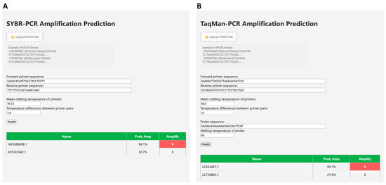 User interface for amplification prediction in the BioInnovate AI platform. (A) The SYBR-PCR amplification prediction interface allows users to upload FASTA files, enter forward and reverse primer sequences, and provide primer melting temperature information and temperature differences. (B) The TaqMan-PCR interface extends this functionality by enabling probe sequence and probe melting temperature input. Both interfaces display predicted amplification probabilities in a results table, with successful amplification indicated by a red “✔” and failure by a gray “✘”.