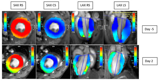 This figure shows the evaluation of the strain in an example mouse. The color visualizes the corresponding strain. Day -5 before ligature is in the upper row, and day 2 after ligature is in the lower row; SAX, short axis; LAX, long axis; RS, radial strain; LS, longitudinal strain; CS, circumferential strain.