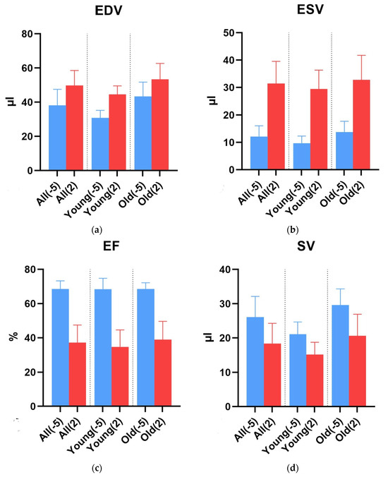 This figure shows a graphical representation in the form of bar charts of the mean and deviation values from Table 1. Day -5 before LAD ligature is blue, and day 2 after ligature is red. All charts show, for both groups combined and both groups separately, (a) the EDV; (b) the ESV; (c) the EF; and (d) the SV. EDV, end-diastolic volume; ESV, end-systolic volume; SV, stroke volume; EF, ejection fraction.