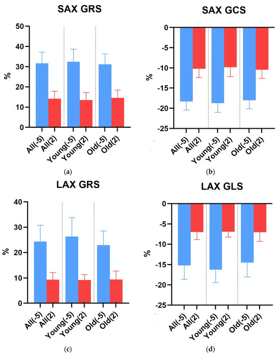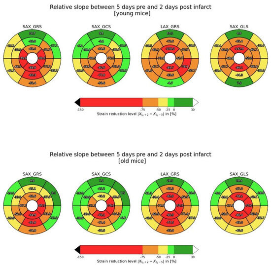 Each strain showed deterioration after infarction (Figure 3a–d). This difference was significant in both subgroups for young mice and old mice at each strain. There were no differences either before or after infarction between the young and old mice. Even so, the strain worsened for all directions and axes (SAX GRS delta −17.6 ± 6.8%, SAX GCS delta 8.1 ± 3.1%, LAX GRS delta −15.0 ± 6.2% and LAX GLS delta 8.2 ± 3.5%, Table 1).