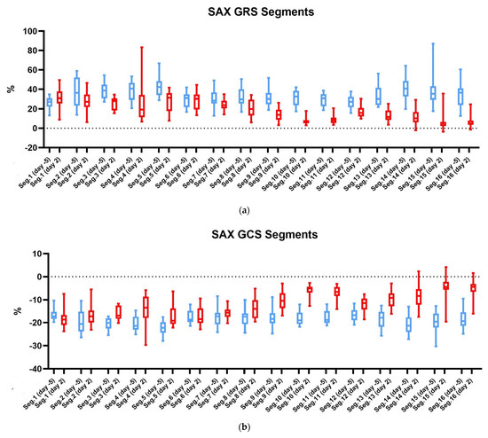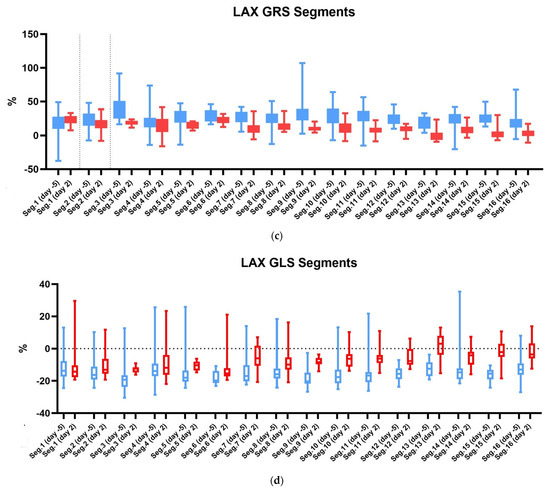 This figure shows a boxplot. Both groups of mice were combined. The strain is shown on the x-axis. The y-axis is divided into the 16 segments of the AHA model and the two time points: (a) the boxplot for SAX GRS; (b) the boxplot for SAX GCS; (c) the LAX GRS; (d) the LAX GLS. SAX, short axis; LAX, long axis; GRS, global radial strain; GLS, global longitudinal strain; GCS, global circumferential strain.