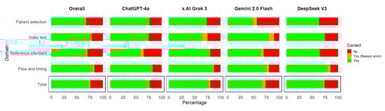 When assessed by domain, the most accurate responses were for flow and timing, followed by index test, and then similarly for patient selection and reference standard (Table 3, Figure 1), ranging from 80.63% to 63.75%. The best models for each domain were ChatGPT 4o and Grok 3 for patient selection; Gemini 2.0 flash for index test; Grok 3 for reference standard; ChatGPT 4o, Grok 3, and DeepSeek for flow and timing. The domain with the highest percentage of answers that were correct but the reasoning was incorrect was the index test (5%), followed by flow and timing (3.12%) (Figure 1).
