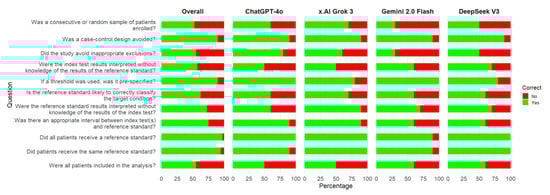 Concerning individual signaling questions, the most problematic ones for the LLMs were as follows (Figure 2): Was a consecutive or random sample of patients enrolled? Did the study avoid inappropriate exclusions? Were the index test results interpreted without knowledge of the results of the reference standard? Were all the patients included in the analysis? Is the reference standard likely to correctly classify the target condition?