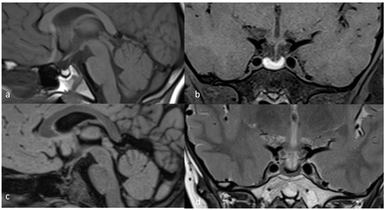 As seen in Figure 3, the latest MRI investigation performed in March 2025, as well as other MRI investigations during follow-up, revealed the presence of hemoglobin breakdown products located within the anterior lobe of the pituitary gland, strengthening the hypothesis of a pituitary apoplexy without an adenoma.
