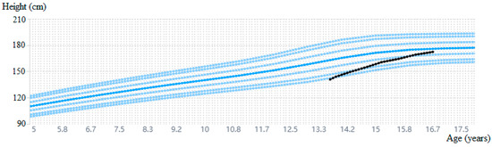 After approximately 2 years of treatment, letrozole was stopped, and in November 2024, rGH treatment was also stopped, given the bone age of 16 years. The patient’s height during the 3 years and 10 months of rGH treatment is shown in Figure 2, reaching 172.3 cm (−0.51 SD) at the last evaluation and surpassing his initial height prediction of 164.5 cm.