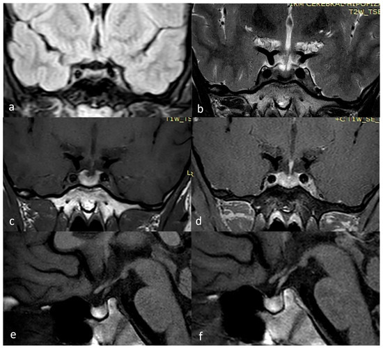 March 2025 MRI scan: (a) FLAIR coronal; (b) T2 TSE coronal; (c) T1 TSE coronal; (d) T1 TSE FS coronal +Gd; (e) T1 TSE sagittal; (f) T1 TSE sagittal +Gd.