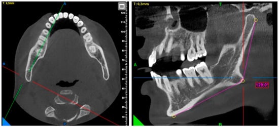 Gonial angle measurement: The menton point was determined by checking from the sagittal, axial, and coronal planes. In the sagittal plane, the gonial angle was measured at the intersection of the line drawn from the gonion point to the posterior of the condyle and the line drawn to the menton point (Figure 1).