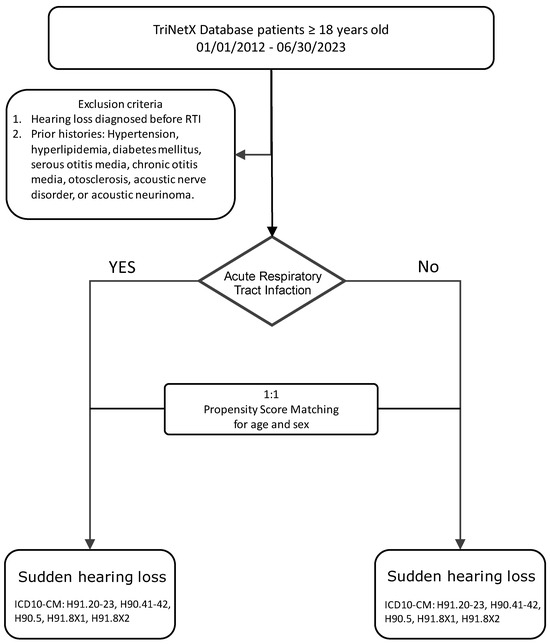 The primary outcome was the diagnosis of sudden sensorineural hearing loss (SSNHL) within 60 days following the index date (RTI diagnosis or assigned control date). SSNHL events were identified using ICD-10-CM codes H90.4, H90.5, H91.2, H91.8X1, and H91.8X2. Patients with a documented SSNHL diagnosis prior to the index date or within the baseline period were excluded to ensure incident cases only (Figure 1).