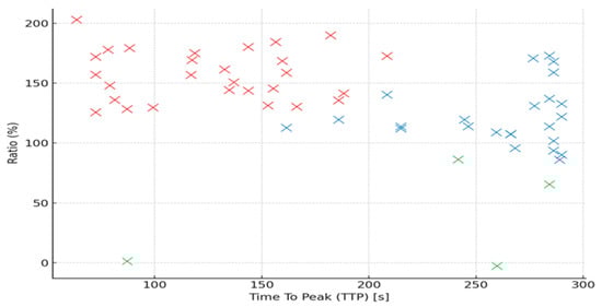 Scatterplot showing the distribution of perfusion parameters (Ratio vs. TTP) by Funaki type (red x—Funaki type I, blue x—Funaki type II, green x—Funaki type III).
